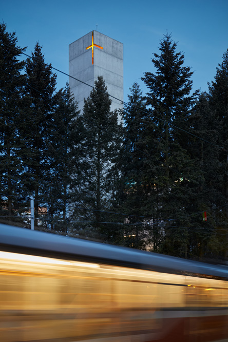 Věž stojí stranou kostela. Její půdorys rovnostranného pravoúhlého trojúhelníku zajišťuje, že vypadá jinak z areálu kostela a jinak zvenčí. Zvenčí je pevným bodem, statickým kubusem, odkazující se na westwerky starých kostelů, ukotvující celý areál na malém skalním ostrohu. Směrem ke kostelu je otevřená svou čtercovou lucernou a jsou v ní ve žluté části zvonohra, v červené vyhlídka na centrum Brna.