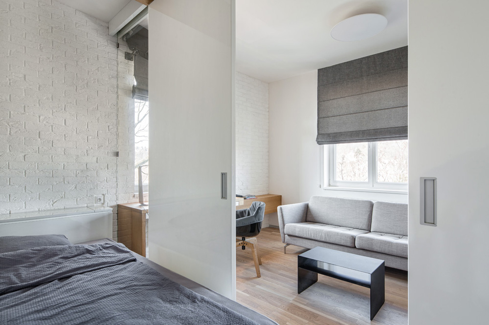 Ve druhé místnosti se nachází obývací pokoj s ložnicí. Vzhledem k tomu, že klient má pracovně velmi nepravidelný režim, který se příliš neohlíží na denní/noční dobu, rozhodli jsme se tuto místnost předělit posuvnými panely a místo na spaní tak v případě potřeby úplně oddělit od obývací části a tím zajistit klid na odpočinek i během dne, aniž by to mělo zásadní vliv na režim jeho partnerky. Tato dělicí stěna je v jedné části prosklená, aby se, pokud si klient přeje, mohlo do ložnice dostat ranní slunko. V opačném případě jsou okna vybavena zatemňovacími roletami tmavé barvy.